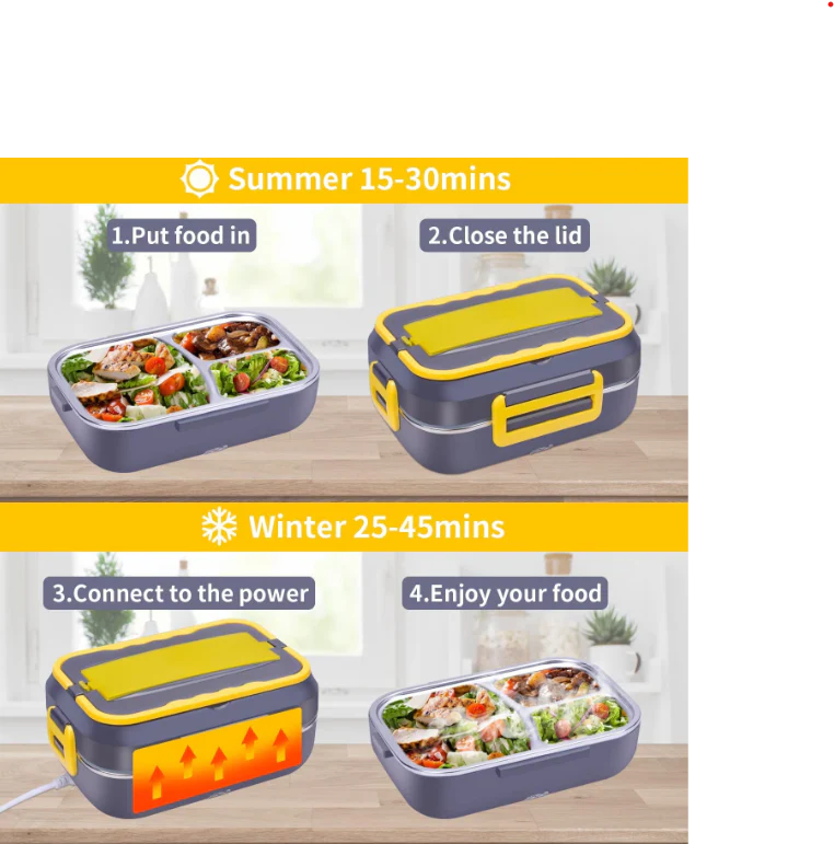 Nu mai pierde timpul căutând un loc pentru a mânca sau reîncălzind mâncarea în mod neuniform. Cutia electrică pentru prânz îți oferă confortul unui prânz cald, gata de consum, oriunde și oricând. Este soluția perfectă pentru cei care călătoresc mult sau pentru cei care lucrează în deplasare.